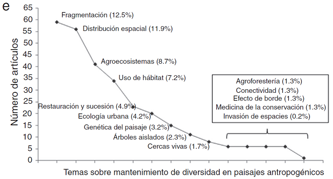Con relación a las consecuencias del cambio de uso del suelo para la biodiversidad, cabe destacar el trabajo pionero del Dr. Gonzalo Halffter, quien introdujo en México la idea de estudiar los patrones de la diversidad alfa, beta y gamma en paisajes modificados por las actividades humanas (e.g., Halffter, 1998). En particular, Halffter (1998) propone evaluar la contribución de la diversidad al interior de las comunidades (alfa) y de la diferenciación entre comunidades (beta) sobre la diversidad regional (gamma). Siguiendo esta estrategia se desarrollaron estudios en México con murciélagos (Moreno y Halffter, 2001), escarabajos (Arellano y Halffter, 2003) y anfibios (Pineda y Halffter, 2004), entre otros. De hecho, a partir del año 2000 encontramos un número creciente de artículos centrados en evaluar los patrones, procesos y mecanismos que contribuyen a mantener poblaciones, comunidades y ecosistemas en paisajes modificados por actividades humanas a diferentes escalas (n = 292, 62%; Fig. 1e). Dentro de estos trabajos, identificamos artículos sobre: a) el efecto de la fragmentación del hábitat sobre las comunidades ecológicas (e.g., Arroyo-Rodríguez et al., 2009, Carrara et al., 2015, Estrada et al., 1993, Rös et al., 2011); b) el papel de los agroecosistemas (i.e., principalmente plantaciones de café) para el mantenimiento de la biodiversidad (e.g., De la Mora et al., 2015, Leyequien et al., 2010, Pineda et al., 2005, Saldaña-Vázquez et al., 2013); c) el uso y la calidad del hábitat de varias especies de animales (e.g., Arroyo-Rodríguez et al., 2007, Pozo-Montuy et al., 2008, Tejeda-Cruz et al., 2009), y d) el impacto de las ciudades sobre la biodiversidad (e.g., Chávez-Zichinelli et al., 2013, López-Flores et al., 2009, Ramírez-Restrepo y Halffter, 2013). Aunque más escasos, también encontramos artículos sobre genética del paisaje (e.g., Figueroa-Esquivel et al., 2010, Ochoa et al., 2012) y evaluaciones sobre el papel de las cercas vivas (e.g., Estrada et al., 2000, Ruiz-Guerra et al., 2014), la conectividad (e.g., Fuller et al., 2006, Herrera-Arroyo et al., 2013) y los bordes forestales (i.e., efectos de borde) para la biodiversidad (e.g., López-Barrera et al., 2007, Urbina-Cardona et al., 2006). En general, todos estos trabajos han contribuido a mejorar nuestro entendimiento sobre el efecto que tienen los cambios en la heterogeneidad espacial del paisaje sobre la biodiversidad, así como el papel que juegan algunos elementos paisajísticos (e.g., fragmentos de hábitat, corredores de vegetación, bordes forestales) para el mantenimiento de la diversidad biológica.