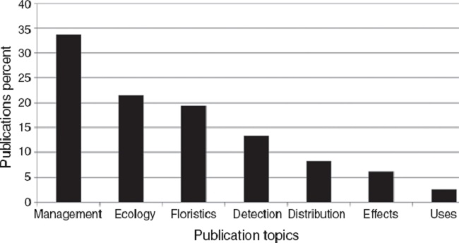 The publications’ topics are represented in Figure 1. Most papers (34.5%) deal with management sensu lato, including restoration, and chemical, cultural or biological control; 21.5% with several ecological topics; 19.5% of papers deal with floristics; 13% with detection of new non-native weeds, usually accompanied by the distribution range when the non-native was discovered; 8% deal with actual and potential distribution of naturalized or invasive plants; 6% deal with the economic or ecological impact of non-native weeds; and finally 3% deal with non-native species uses or ethnobotany. Percentages add up to 105.5% as there were publications included in more than 2 topics. Publications that covered more than one topic were assigned to their predominant one; if 2 or more predominated equally, then the publications were considered in more than one topic.