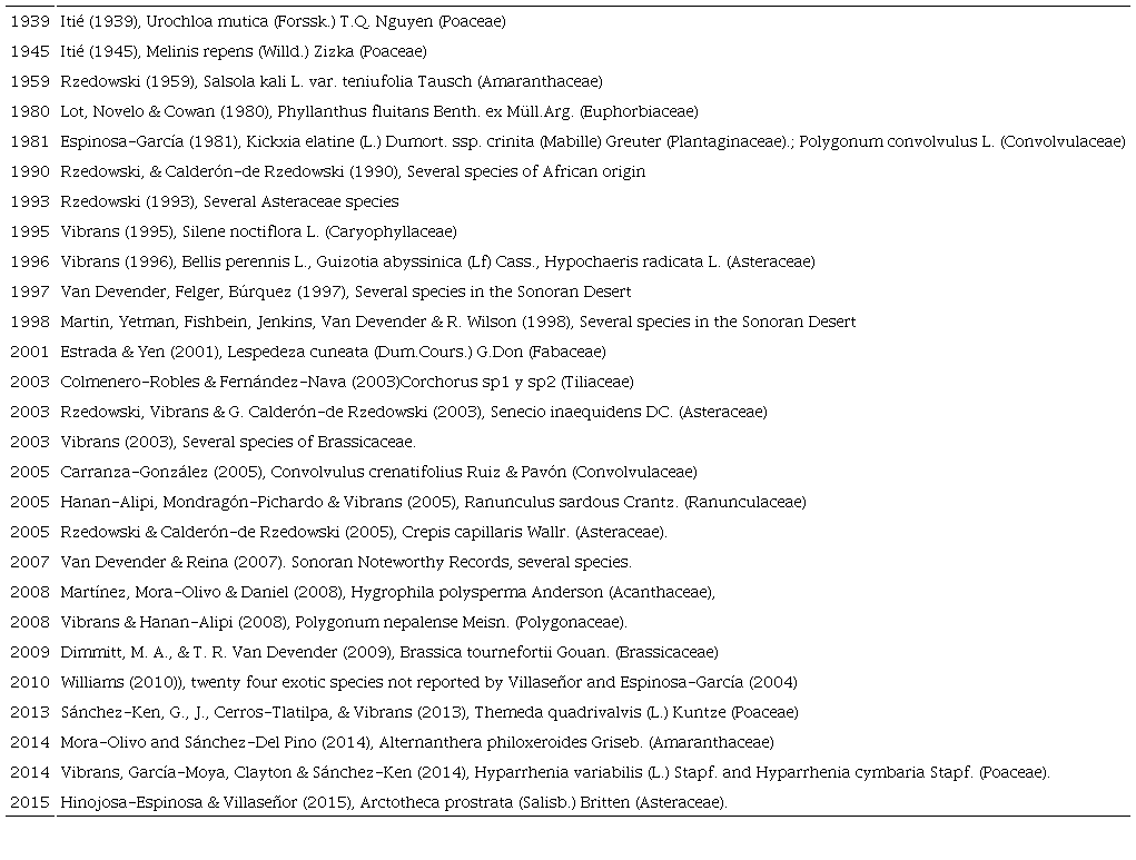 In 2004, 618 non-native species were reported for Mexico (Villaseñor & Espinosa-García, 2004); with 22 species added in 2009 (Espinosa-García et al., 2009). In this review, 31 previously undetected species have been added (Table 1), but recent reviews of the non-native weedy Poaceae and Asteraceae (Sánchez-Ken et al., 2012, Villaseñor et al., 2012), changed the non-native status of 39 species, but reported 40 previously undetected wild species, many of them formerly known as ornamentals. Additionally, JLV has detected 26 more species in his database (not reported here). These data add up to 698 non-native species registered for Mexico, but recent publications (not included in this review) enlist additional non-native species with unknown wild or cultivated status. We are currently revising the entire list of wild non-native species in Mexico for a future publication, but we estimate that the actual figure for wild non-native species for Mexico to be in the order of 700-750 species.