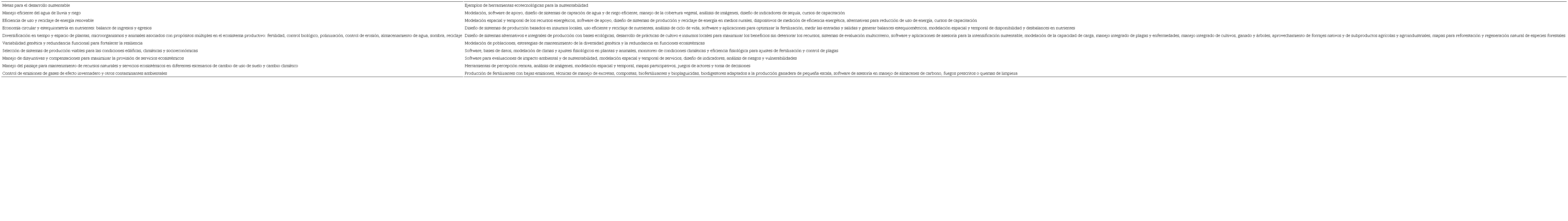 La innovación ecotecnológica en agricultura y el uso de los recursos naturales implica el desarrollo de métodos y acciones para lograr los puntos indicados en el párrafo previo; es el aprendizaje social del sistema que resulta en su ajuste continuo. Es, en nuestra definición, lo que conduce a la sustentabilidad de un sistema socioecológico (Ostrom, 2007). Tal sistema es divisible en los subsistemas de los contenedores de los recursos (e.g., el agroecosistema, la selva, el humedal), del recurso aprovechado (la madera, el cultivo, los peces), de la gobernanza (las reglas, acuerdos, leyes e instituciones que rigen el acceso al recurso y su aprovechamiento), de los usuarios y de sus interacciones, que resultan en la condición final del sistema (en inglés el «outcome»). El sistema se encuentra inmerso en un sistema ecológico mayor, como también en un contexto social y político, que definen el marco de respuesta y adaptación del sistema. La innovación ecotecnológica abarca estos subsistemas e interacciones y propicia precisamente la sustentabilidad del socioecosistema agrícola (Tabla 2).