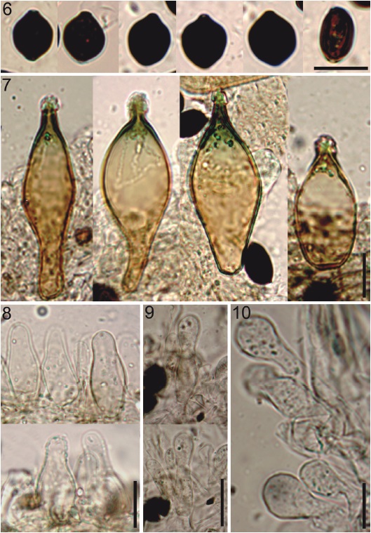 Basidiospores 11.5-14.5 × 9-11 µm (Q =1.13-1.48, Qm = 1.28, n = 30/1/3), limoniform in face-view, ellipsoidal in side-view, apically truncate by a germ-pore, thick-walled, reddish brown to black in KOH (Fig. 6), not bleaching in 95-98% sulfuric acid. Basidia 17-22.5 × 9-12.5 µm, broadly clavate to cylindric-clavate, tetrasporic, hyaline. Pleurocystidia 33.5-68 × 15-25 µm, as metuloids, abundant, pedicellate-utriform, broadly-fusiform, with acuminate and incrusted apex (muricate), thick-walled ≥ 1.5 µm, light brown with brown wall and greenish apex in KOH (Fig. 7). Cheilocystidia 21-37 × 7-14 µm, abundant, lageniform, obpyriform, some sphaeropedunculate, wall slightly thickened (< 1 µm), hyaline in KOH (Fig. 8). Lamella edge sterile. Lamellar trama irregular, with filamentous to inflated hyphae 5-20.5 µm diam., smooth, thin-walled, yellowish brown in KOH. Subhymenium a layer of subparallel hyphae, 1.5-4 µm diam., smooth, thin-walled, yellowish brown in KOH. Pileipellis an epithelium of isodiametric to pyriform elements, 11.5-29.5 µm diam., smooth, thin-walled, hyaline in KOH. Pileocystidia scarce, and in fascicles in the pileus margin 24-45 × 5.5-10 µm, lageniform to lageniform-subcapitate, thin-walled, hyaline in KOH (Fig. 9). Hypodermium with interwoven, filamentous hyphae, 2.5-8.6 µm diam., smooth, light brown in KOH. Pileus trama with irregular and inflated hyphae, 8-34.5 µm diam., yellowish brown in KOH. Stipitipellis a cutis, composed of filamentous hyphae 3-4 µm diam., smooth, yellowish brown in KOH. Stipe trama regular, 4.5-18 µm diam., smooth, wall slightly thickened, < 1 µm, yellowish brown to green grayish in KOH. Caulocystidia 22-47 (-94.5) × 7.5-14 µm, sphaeropedunculate, clavate or lageniform, non-incrusted at apex, thin-walled, hyaline in KOH (Fig. 10). Clamp connections present.