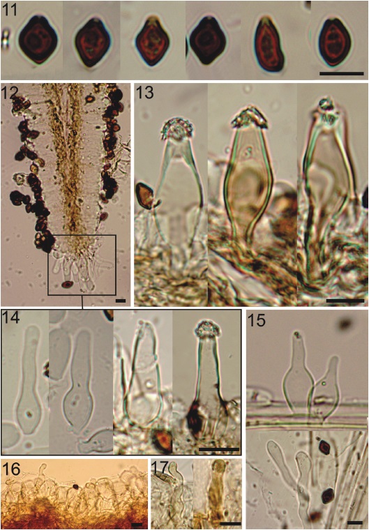 Basidiospores 6-9 × 4.5-6.5 µm (Q = 1.16-1.89, Qm = 1.44, n = 75/3/3), lenticular, limoniform in face-view, broadly ellipsoid in side-view, with truncate base and distinct germ-pore, thick-walled, reddish brown in KOH (Fig. 11), not bleaching in 95-98% sulfuric acid. Basidia 13-18 × 5-12 µm, cylindric-clavate to clavate, tetrasporic, hyaline. Pleurocystidia 24-50 × 7-16 µm, as metuloids, not abundant, pedicellate-utriform, some subcylindrical or subfusoid with obtuse apex, thick-walled, < 1 µm at the base and central portion, 1.5-3 µm in extreme apex, which also is incrusted crystals at apex (muricate), light brown in KOH (Fig. 13). Cheilocystidia 24-37 × 4-9 µm, abundant, obclavate, lageniform, wall slightly thickened, < 1 µm, without crystals incrusted at apex, hyaline in KOH, rarely thick-walled with crystals incrusted at apex (Fig. 14). Lamella edge sterile (Fig. 12). Lamellar trama irregular, with filamentous to inflated hyphae 5.2-15 µm diam., thin-walled, smooth, yellowish brown in KOH. Subhymenium with filamentous hyphae, 1.6-3.5 µm diam., smooth, thin-walled, light brown in KOH. Pileipellis an epithelium of cylindrical, isodiametric to pyriform elements, 9.5-22 µm diam., smooth, thin-walled, yellowish brown in KOH (Fig. 16). Pileocystidia scarce 22-40 × 4-8.5 µm, vesiculose-clavate to lageniform, thick-walled 0.5-1.5 µm, mostly yellowish brown in KOH, rare brownish (Fig. 17). Hypodermium a layer of filamentous hyphae, 2-8.5 µm diam., parallel, horizontally arranged, smooth, thin-walled, light brown in KOH. Pileus trama with inflated hyphae 3-5.5 µm diam., thin-walled, yellowish brown in KOH. Stipitipellis composed of a cutis of filamentous hyphae 1-3.5 µm diam., parallel, smooth, yellowish brown in KOH. Stipe trama regular, with inflated hyphae, 4.5-19.5 µm diam., smooth, yellowish brown in KOH. Caulocystidia 14-49 × 3-11 µm, pyriform, cylindrical, lageniform, wall slightly thickened (< 1 µm), non-incrusted at apex, hyaline in KOH (Fig. 15). Clamp connections absent.