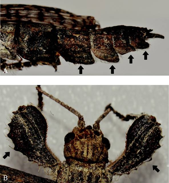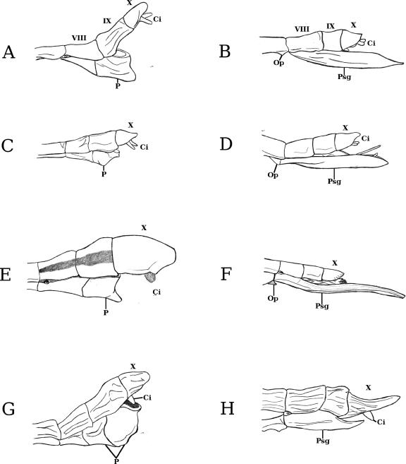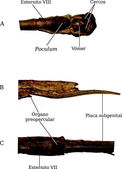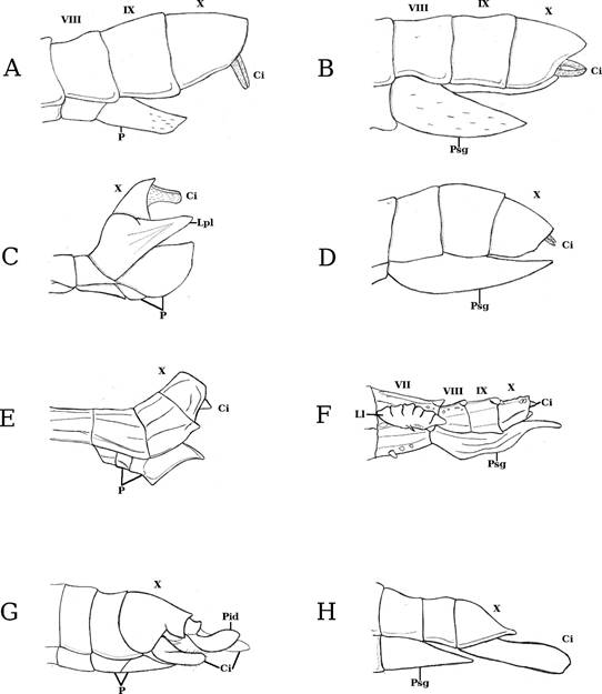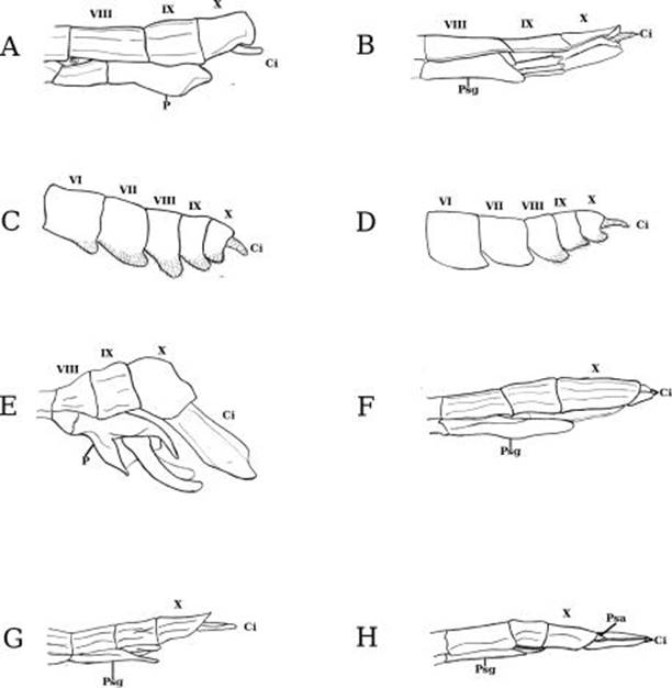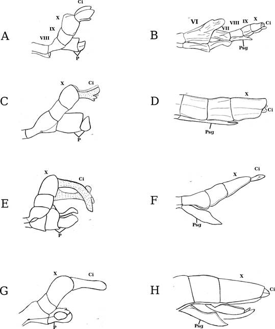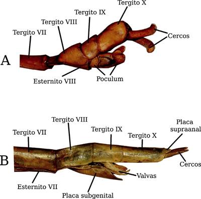 Los esquemas se realizaron con base en las fotografías tomadas en la CNIN, así como las imágenes obtenidas de Brock et al. (2016) y diversos esquemas obtenidos en la literatura siguiente: Zompro (2001a), Conle y Hennemann (2002) y Hennemann y Conle (2012b), los cuales se procesaron con GIMP 2.8 2012. Los organismos ilustrados se escogieron con el siguiente orden de prioridad: 1, especie que se distribuye en México y que presente buenas ilustraciones; 2, especie tipo del género y 3, cualquier especie perteneciente al género aunque no habite en México y se tuviera acceso para obtener fotografías.