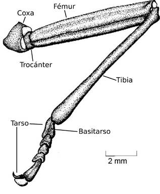 Las superficies y carinas de las patas son nombradas tomando la siguiente posición: pata extendida perpendicular al cuerpo, la superficie superior es dorsal, la inferior es ventral, la superficie frontal es anterior o proximal y la superficie posterior es distal o posterior. Una carina en el centro de cualquiera de estas superficies es llamada carina media y se agrega el término (anterior, posterior, ventral o dorsal) de acuerdo con la superficie en la que se localiza, ejemplo: carina mesoventral.