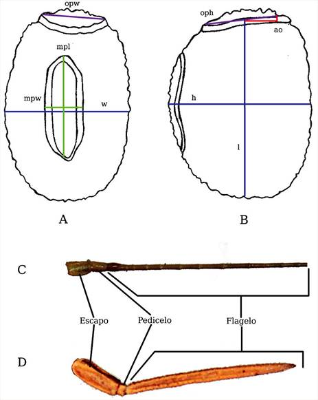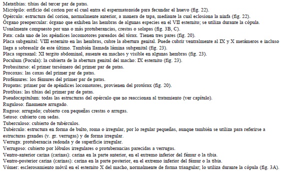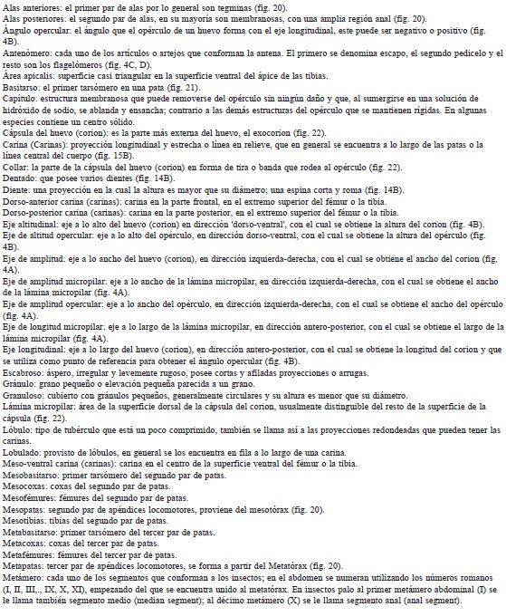 Para la elaboración del glosario (Tabla 2) se consultaron los trabajos de Clark (1976a, b, 1979) y Sellick (1997a, b, 1998), quienes definieron la terminología apropiada para la descripción de los huevos de los insectos palo. También se consideró el trabajo de Bragg (1997), quien elaboró el primer glosario de términos empleados en el orden Phasmatodea. Posteriormente se efectuaron las equivalencias a los términos y sus definiciones al español. Las definiciones se representaron con las imágenes utilizadas en la clave de determinación taxonómica.