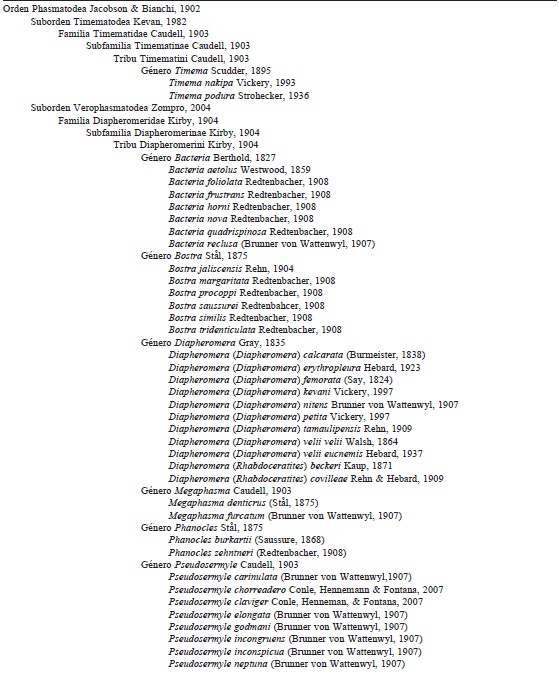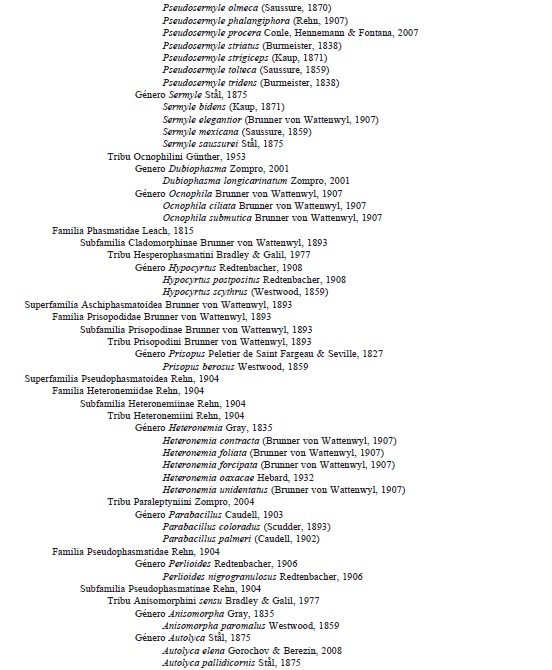 La lista formal de los Phasmatodea de México hasta este trabajo era inexistente, pues la mayoría de las compilaciones trataban con todo el orden: Gray (1835), Burmeister (1838), Westwood (1859) y Stål (1875a, b); o bien solo consideraron nuevos registros: Rehn (1904b), Hebard (1932), Vickery (1993, 1997), Zompro (2001a, b), Conle et al. (2007) y Gorochov y Berezin (2008); o simplemente no incluyeron los trabajos de nuestra región sobre Phasmatodea, como en Brock et al. (2016).