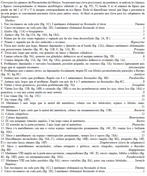 Al tomar en cuenta estas situaciones y considerando que no se había realizado una clave de identificación taxonómica sobre los géneros de Phasmatodea de México, en este trabajo se ha aportado la primera clave taxonómica a nivel genérico de los insectos palo reportados para el país.