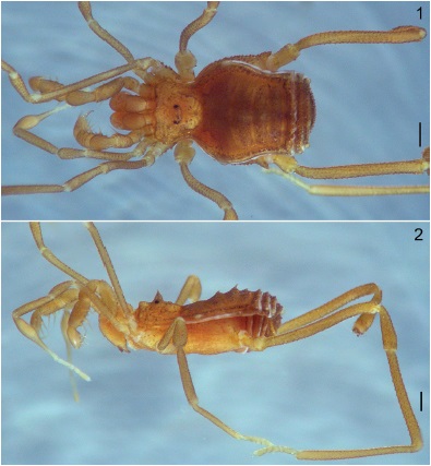The type material was deposited in the Colección Nacional de Arácnidos (CNAN), Universidad Autónoma de México (UNAM). Additional material of Potosa spp., from CNAN and Texas Tech University (TTU), USA, was examined (see other material examined section). Color images were obtained using a Nikon Coolpix S10 camera attached to Nikon SMZ645 microscope. SEM’s photos were taken using a Hitachi S-2460N Scanning Electronic Microscope following the procedure suggested by Acosta et al. (2007). Plates of figures were made and edited through Photoshop CS5. Morphological nomenclature follows Cruz-López & Francke (2015, 2017), dorsal scutum nomenclature according to Kury and Medrano (2016), pedipalpal armature follows Acosta et al. (2007), and macrosetal nomenclature of male genitalia (A to E groups) according to Kury and Villarreal (2015), with modifications proposed by Cruz-López and Francke (2017). Distribution map was generated through ArcGIS Online basemaps using ArcGIS online content (available at: www.arcgis.com). Measurements are given in mm and µm. Abbreviation: MS = macrosetae.