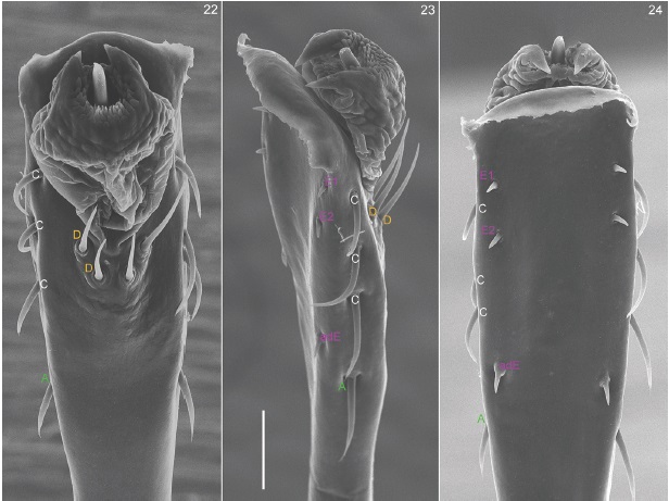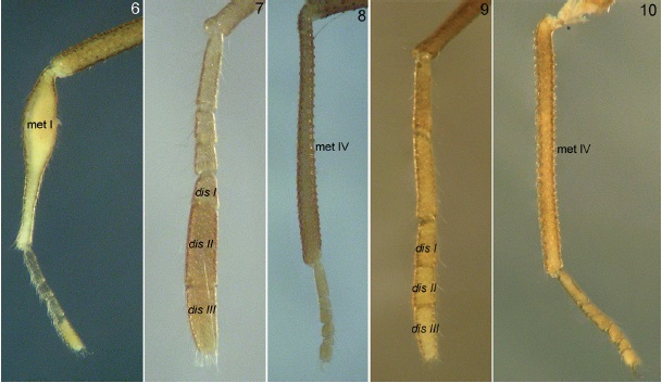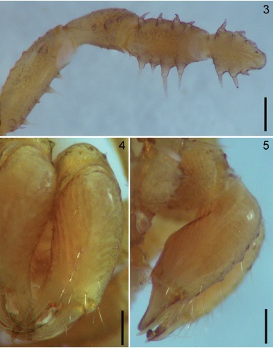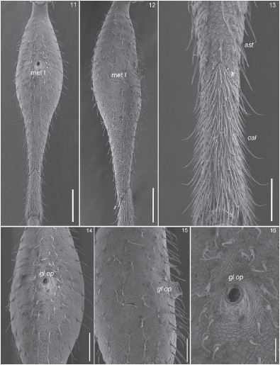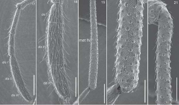 Description (male holotype). Dorsum: scutum gamma type (γ), with median bulge rounded and well-marked from sulcus I to sulcus III; constriction I deep and rounded, constriction II shallow, continuous with the coda; coda straight, posterior apices of scutum softly rounded (Fig. 1). Prosoma hexagonal shape, wider at the level of ozopores. Ocularium in the middle of prosoma, base elliptical, triangular in lateral and frontal view, with small apical spine, contiguous with the ocularium (Fig. 2). Mesotergum with 5 well-marked areas, area I larger than the remaining, area II slightly smaller than area I; areas III and IV similar in shape; sulci II and III retrocurved, IV and V straight. Area I with few and central small tubercles, areas II and III with similar ornamentation, but with the central tubercle developed in a backward spine, larger in area III; areas IV and V with transversal row of spiniform tubercles. Free tergites with transversal row of tubercles, similar to those on mesotergal areas IV and V, but smaller. Lateral channels projected as clear areas at level of mesotergal area I, just on the wider portion of scutum, these clear areas are softly rounded; corners of area V and free tergites I and II with similar projections (Figs. 1, 2). Venter: coxae IV covering almost all area in ventral view, all coxae covered with scattered small tubercles and few setae. Stigmatic area in triangular shaped, genital operculum rounded, small. Spiracles visible. Chelicera: small, bulla weak, cheliceral fingers with at least 5 small and contiguous teeth (Figs. 4, 5). Pedipalp: femur sub-rectangular, with dorsal surface slightly convex; ventrally with a row of 5 spiniform setiferous tubercles, the basalmost longer, on the meso-apical surface, with a setiferous tubercle. Patella cylindrical, with 3 setiferous tubercles on mesal side. Tibia with 4 setiferous tubercles on each side as follow: IiII, (3 > 1 = 4 > 2). Tarsus with 3 setiferous tubercles on each side as follow: III, (1 > 2 > 3). Claw shorter than tarsus (Fig. 3). Legs: Measurements in the Table 1. All legs are slender, covered by small tubercles on trochanters to metatarsi, tarsi covered by small setae. Metatarsus I very swollen, with the glandular opening in the middle, dome-shaped, calcaneus on the apical portion of metatarsus (Figs. 6, 11-16). Distitarsi II and III of the leg II bigger and swollen, distitarsus II noticeably larger than distitarsus I (Figs. 7, 17, 18). Femur IV covered by scattered tubercles, slightly curved in the middle and swollen apically (Figs. 8, 19-21). Tarsal count 4(2):6(3):6:6. Male genitalia: pars distalis flattened dorso-ventrally, apical margin of flimsy lamina slightly curved ventrally; apical margin irregular shape, with 2 lateral pointed lateral lobes (Figs. 22-25). The follis originate in the middle of pars distalis, completely exposed, with the latero-apical projections ventrally projected; the spiniform projections covering all interno-apical surface of follis; stylus originated from the inner follis, with apical bristles (Figs. 22-25). Macrosetal pattern as follow: MS C forming a longitudinal row on lateral margins of pars distalis, these setae are long and curved, widely separated each other; a pair of long and curved MS A, just below of row of MS C, on the basalmost part of pars distalis; 2 pairs of long MS D forming a high trapeze, below to the base of follis, sockets of these setae well-marked, rounded; ventrally with 3 pairs of small MS E, E1 and E2 subapically, forming a rectangle, an additional pair of small MS E on the basal pars distalis, between the lowest C and A pairs (Figs. 22-24).