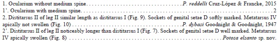 Potosa elsanto sp. nov., can be easily recognized from the troglomorphic P. reddelli by the following combination of characters: presence of middle spine on the ocularium (Fig. 2), mesotergal areas II and III with median tubercles developed (Figs. 1, 2), metatarsus I in males very swollen with glandular opening in the middle of metatarsus (Fig. 11), and by the presence of an additional pair of MS E on the penis (Fig. 24), instead 2 pairs as in P. reddelli. Also the new species described here can be recognized from P. dybasi by the following combination of characters: spine of the ocularium not acute, contiguous with the ocularium (Fig. 2), distitarsus II of leg II very large, longer than distitarsus I, instead of similar size on P. dybasi (Figs. 7, 9, 18); penis with sockets of macrosetae D rounded, well-marked (Fig. 22); metatarsus IV of males swollen apically and slightly curved in the middle instead of femur straight and not swollen apically on P. dybasi (Figs. 8, 10, 19).