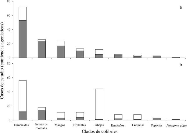 La identidad de los clados tuvo un efecto significativo en la frecuencia de contiendas agonísticas ganadas (x 2 = 176.96, g.l. = 8, p < 0.001) y perdidas (x 2 = 145.59, g.l. = 8, p < 0.001). Los clados de aquellas especies que dominaron la mayor cantidad de encuentros agonísticos fueron: Esmeraldas, Gemas de Montaña y los Mangos. Los colibríes Esmeraldas dominaron el 45% (n = 72 contiendas), las Gemas de Montaña dominaron el 16% (n = 26 contiendas) y los Mangos el 15% (n = 24 contiendas) de los casos de estudio incluidos en este estudio. El tamaño corporal de los contendientes tuvo un efecto significativo en el resultado de los enfrentamientos (x 2 = 39.69, gr.l. = 1, p < 0.001), ya que las especies de todos los clados ganaron más encuentros agonísticos cuando fueron la especie más grande de la contienda (Fig. 1a) y perdieron mayor cantidad de encuentros al ser el contendiente más pequeño (Fig. 1b).
