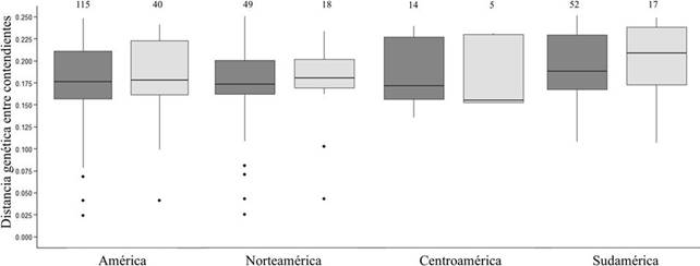 Para el análisis de las diferencias entre la distancia genética de colibríes de especies grandes y pequeñas que ganaron enfrentamientos agonísticos solo se incluyeron 155 de los 160 casos de estudio. Esto se debió a la falta de secuencias del gen mitocondrial NADH deshidrogenasa subunidad 2 para las siguientes especies: Eriocnemis mirabilis, Chlorostilbon gibsoni y C. auriceps. En estos 155 casos, no se encontraron diferencias significativas entre la distancia genética de los contendientes que participaron en los encuentros ganados por colibríes de especies más grandes y pequeñas (H = 0.204, p = 0.651; Fig. 2). Al analizar los casos de estudio por región geográfica tampoco se encontraron diferencias significativas entre la distancia genética de los colibríes que ganaron contiendas contra competidores de especies de tamaños distintos (Norteamérica, H = 0.432, p = 0.510; Centroamérica, H = 0.482, p = 0.487 y Sudamérica, H = 0.141, p = 0.706; Fig. 2).