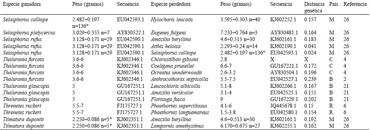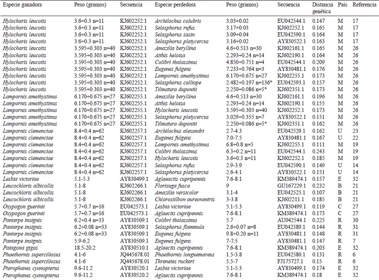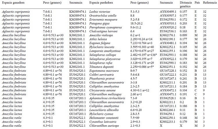 Para los análisis, a cada especie se le asignó el clado de pertenencia de acuerdo a McGuire et al. (2014). En la búsqueda se encontraron interacciones que involucraron a especies pertenecientes a los 9 clados de colibríes: Ermitaños, Topacios, Mangos, Brillantes, Coquetas, Esmeraldas, Gemas de Montaña, Abejas y al compuesto por Patagona gigas; este último conformado únicamente por la especie de colibrí de mayor tamaño corporal (i.e., colibrí gigante; 20-22 cm y 18.5-20.2 g; Schuchmann, 1999). La distancia genética entre cada par de colibríes contendientes se calculó utilizando secuencias genéticas mitocondriales del gen NADH deshidrogenasa subunidad 2, (sensuMartin y Ghalambor, 2014) disponibles en Genbank (Tabla 1). Las secuencias fueron alineadas mediante el algoritmo de alineamiento ClustalW (Thompson et al., 1994) y posteriormente se calculó la distancia genética entre cada par de especies mediante el modelo de Tamura-Nei (Tamura y Nei, 1993), el cual corrige las sustituciones múltiples en un sitio considerando las diferencias en la tasa de sustitución nucleotídica entre secuencias de DNA. Estas fueron obtenidas en MEGA versión 7.0 (Kumar et al., 2016).