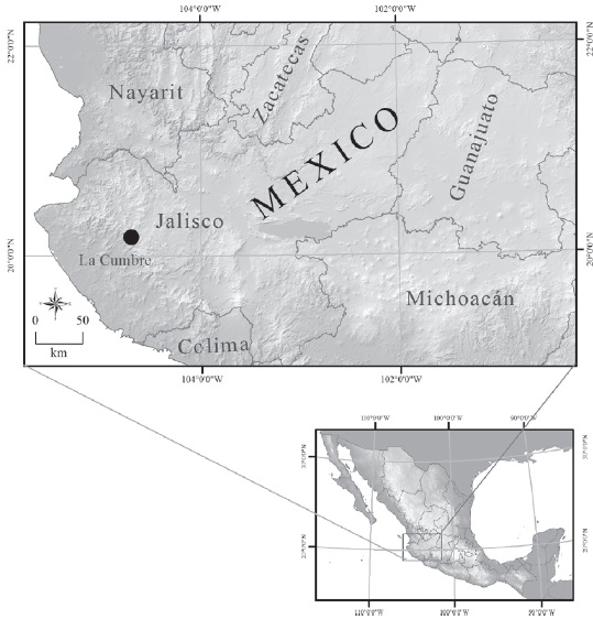 El sitio de estudio se localiza en la sierra de Cacoma al occidente de Jalisco, México en el paraje denominado La Cumbre de Guadalupe, una región de confluencia entre la cordillera del Eje Neovolcánico Transversal y la sierra Madre del Sur (Fig. 1). Corresponde a una elevación de 2,119 m , y se extiende hasta el litoral del Pacífico y la costa del occidente de México (Inegi, 2015). El área de estudio es una zona de gran complejidad geomorfológica y litológica que presenta afloramientos rocosos formados a partir de procesos tectónicos que dieron lugar al levantamiento de un batolito (rocas ígneas intrusivas) y pisos marinos (rocas calizas) durante el Cretácico (Conabio, 2010). El tipo de suelo es regosol dístrico, cambisol dístrico y litosol (Inegi, 1976). Presenta un clima templado subhúmedo, con una temperatura media anual de 14.2 °C, precipitación anual de 2,003 mm con lluvias en verano (estación 14,271 de la localidad La Cumbre de Guadalupe, altura 2,120 m snm, 20°10’20” N, 104°42’45” O, Servicio Meteorológico Nacional, http://smn.cna.gob.mx/). La temperatura media del mes más cálido (mayo y junio) es de 16.7 °C. La precipitación está concentrada de mayo a septiembre y durante los meses de junio a enero y la incidencia de neblina es frecuente (Fig. 2). En la actualidad corresponde a un tipo de vegetación dominado por diversas especies de Pinus y Quercus, así como individuos de Abies jaliscana. Los elementos florísticos comprenden a Alnus acuminata, A. jorullensis, Arbutus xalapensis, Carpinus tropicalis, Clethra fragrans, Pinus oocarpa, P. jaliscana, P. herrerae, P. pseudostrobus, Quercus castanea, Q. candicans, Q. scytophylla, Q. magnoliifolia, Q. obtusata y Ternstroemia lineata. El componente herbáceo es diverso, representado por Amaranthus palmeri, Chenopodium ambrosoides, Iresine diffusa, Eryngium alternatum, Archibaccharis serratifolia, Baccharis heterophylla, Bidens odorata, B. aurea, Dahlia coccinea, Ageratina choricephala, Melampodium perfoliatum, Piqueria triflora, Podachaenium eminens, Tagetes filifolia, T. lucida, Crotalaria filifolia, C. mollicula, Dalea obreniformis, Mimosa albida, Fuchsia fulgens, Fuchsia microphylla, Salvia iodantha, entre otras.