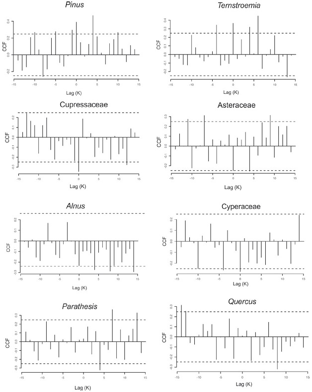 El análisis de correlación cruzada indicó que Cupressaceae, Cyperaceae y Asteraceae se correlacionan negativamente (p < 0.05) con la abundancia de las partículas de microcarbón fósil (lag 0), esto implica que sus abundancias son inversamente proporcionales, es decir cuando las partículas de microcarbón fósil aumentan, los taxones de Cupressaceae, Cyperaceae y Asteraceae disminuyen en su abundancia, más o menos en los mismos intervalos de tiempo. En contraste, se correlacionan positivamente con Pinus y Ternstroemia, ambos en sincronía con las partículas de microcarbón fósil (lag 0), correspondiendo a un incremento con las partículas de microcarbón fósil que coinciden con el incremento en Pinus y Ternstroemia en los mismos intervalos. Por el contrario, Alnus y Parathesis se correlacionan negativamente (p < 0.05) con las partículas de microcarbón fósil (lag 4) y con Quercus (lag 7), lo que significa que el aumento en la abundancia de Alnus y Parathesis ocurre 100 años después de un pico de las partículas de microcarbón fósil y 200 años para Quercus, respectivamente (Fig. 10).