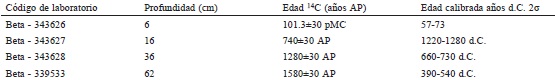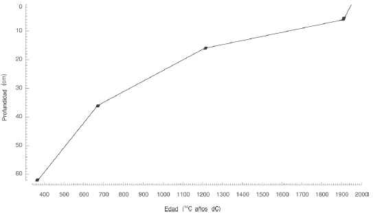 La datación radiocarbono en la base de la secuencia sedimentaria del bosque de Pinus-Quercus-Abies de La Cumbre de Guadalupe (CUM-N2) indica que la acumulación del sedimento comenzó aproximadamente hace 1,580 años sin hiato aparente. Sin embargo, la tasa de acumulación de sedimento no fue constante. El modelo de edad-profundidad (Fig. 3) se obtuvo mediante interpolación lineal a partir de las dataciones obtenidas en 4 fechados 14C (Tabla 1), lo que permitió estimar la tasa de sedimentación promedio de 25 años/cm.