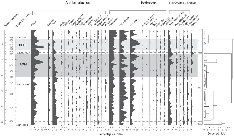 El registro palinológico del bosque de Pinus-Quercus-Abies reveló 67 taxones con 3 zonas palinológicas de acuerdo al análisis de conglomerados (Fig. 4). Pinus se presentó en toda la secuencia estratigráfica dominando el estrato arbóreo, principalmente durante la ACM y la PEH, con fluctuaciones constantes en su porcentaje a lo largo de toda la secuencia. En el estrato herbáceo las familias Asteraceae, Cyperaceae, Poaceae, Polypodiaceae, Aspleniaceae y Adiantaceae fueron los taxones más dominantes y al igual que Pinus estas familias estuvieron presentes en toda la secuencia estratigráfica. En el grupo de pteridofitas sensu lato Hymenophyllaceae fue la familia más dominante. Algunos taxones de bosque mesófilo de montaña (Ostrya-Carpinus, Parathesis y Fraxinus) también estuvieron presentes, aunque poco representados en toda la secuencia estratigráfica. La zonación de los datos palinológicos se describe a continuación expresada en años de la era común.