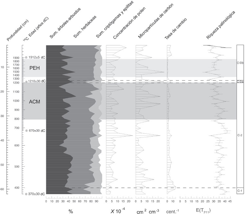 Palabras clave: Anomalía Climática MedievalAnomalía Climática Medieval,Pequeña Edad de HieloPequeña Edad de Hielo,PaleoecologíaPaleoecología,Macropartículas de carbón fósilMacropartículas de carbón fósil,Polen fósilPolen fósil.
