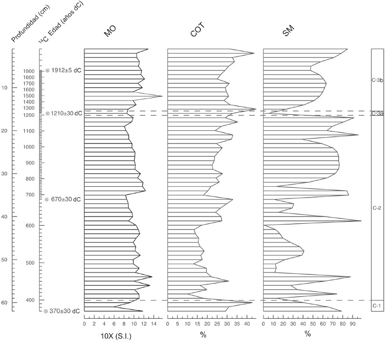 Como indicador de cambio paleoambiental se utilizó la susceptibilidad magnética, ésta mide el aporte de minerales magnéticos en el sedimento (Thompson y Oldfield, 1986) y se considera como un indicador de procesos de erosión. El análisis de susceptibilidad magnética se realizó cada centímetro a lo largo del núcleo de sedimento de 62 cm utilizando un dispositivo Bartington MS2 (Bartington Instruments, Witney Oxford, Reino Unido). Se determinó la pérdida progresiva por ignición (LOI) con el fin de estimar el contenido de materia orgánica y carbonatos del núcleo de sedimento utilizando las relaciones lineales entre los valores LOI y el contenido de materia orgánica y los carbonatos expresados en porcentaje (Dean, 1974). Este análisis se realizó a cada centímetro en todo el núcleo de sedimento, tomando muestras de 0.5 cm3 y mediante la pérdida de peso en las muestras al ser sometidos a altas temperaturas secuenciales (550 °C y 910 °C). La interpretación en los cambios de porcentaje de LOI está relacionada con eventos de mayor productividad y estabilización de la vegetación. El análisis de la composición de elementos químicos (e.g., As, Ca, Fe, Mo, Pb, Rb, Sr, Ti, Zn y Zr) se realizó por medio de fluorescencia de rayos X (FRX) a cada 3 centímetros en todo el núcleo de sedimento con un espectrómetro manual Thermo Scientific Niton XL3t. Los resultados del análisis de elementos se expresan en la concentración de partes por millón (ppm) los cuales se utilizan como indicadores de cambios ambientales. En particular el titanio es considerado indicador del registro de aporte de humedad (registro clástico), mientras que el Ca puede indicar momentos de menor sedimentación, por lo que valores altos de Ti y bajos de Ca indican un incremento en el aporte de sedimentos terrígenos