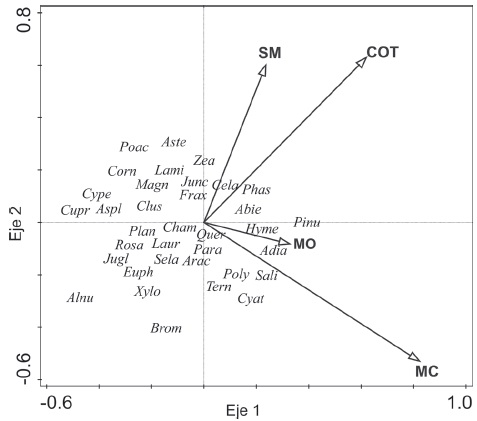 El RDA extrajo el 69.64% del total de la varianza en los 2 primeros ejes; el primero explicó el 43.39% de la varianza; las variables con mayor correlación con este eje fueron las partículas de microcarbón fósil (MC), los carbonatos (COT) y la materia orgánica (MO) (Tabla 2); los principales taxones asociados a estos gradientes ambientales fueron Pinus, Adiantaceae e Hymenophyllaceae (Fig. 8). En el eje 1 los taxones estrechamente asociados con MC fueron Cyathea (Cyat), Salix (Sali), Ternstroemia (Tern) y Polypodiaceae (Poly). En el eje 2, las variables ambientales que resultaron significativas fueron COT y SM, mientras que los taxones estrechamente relacionados con COT y SM fueron Phaseolus (Phas), Celastraceae (Cela), Juncaceae (Junc), Fraxinus (Frax), Arbutus (Arbu), Onagraceae (Onag) y Zea (Fig. 8).
