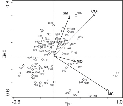 La ordenación de las edades mediante RDA, agrupó en el eje uno a 439, 647, 967, 1048,1210 y 1491 d.C. cerca del vector MC, que corresponden a las edades con las mayores concentraciones de las partículas de microcarbón fósil en la secuencia. En el eje 2 se agruparon las edades de 393, 1156,1280, 1701, 1935, 1942 y 2012 d.C. cerca de los vectores COT y SM (Fig. 9).