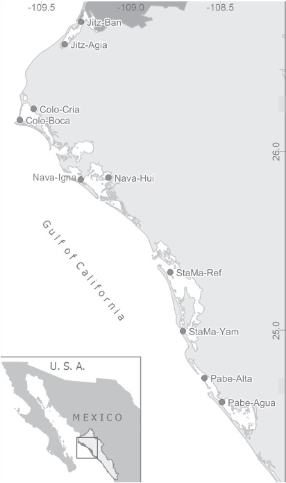 Los sitios elegidos para la recolecta de ejemplares se ubicaron en 5 sistemas lagunares costeros de Sinaloa que cubren la mayor parte de la zona costera del centro-norte del estado y en los cuales se registra más del 70% de la producción de pesca ribereña (Delegación de Pesca de Sinaloa, datos no publicados). La distancia entre los puntos más alejados es de aproximadamente 320 km. Dentro de cada laguna se colectaron individuos en 2 sitios: en la boca y en la parte más interna. Se realizaron lances con red suripera (luz de malla de 1”) en octubre de 2011 en las localidades siguientes: Agiabampo (Jitz-Agia) y Banderas (Jitz-Ban) en la bahía de Jitzamuri, estero criadero (Colo-Cria) y boca (Colo-Boca) en la bahía del Colorado, San Ignacio (Nava-Igna) y Huitussi (Nava-Hui) en la bahía de Navachiste, Reforma (StaMa-Ref) y Yameto (StaMa-Yam) en bahía Santa María y Altata (Pab-Alt) y Las Aguamitas (Pab-Agua) en la ensenada del Pabellón-Altata (Fig. 1). Se colectaron 50 ejemplares por sitio, de los cuales se cortaron 2 pleópodos para preservarlos en etanol al 80%.