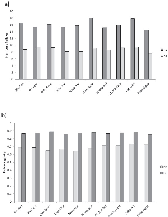 Las frecuencias de los alelos más comunes fueron en general similares entre localidades, con algunas diferencias particulares (tabla 1). Sobresale una elevada cantidad de alelos en cada microsatélite, con diferencias de una sola base. La diversidad genética en las localidades fue relativamente elevada (tabla 2) con valores promedio de número de alelos por locus na = 16.1, número efectivo de alelos por locus ne = 8.8, y heterocigosidad esperada He = 0.87, aunque con una menor heterocigosidad observada (Ho = 0.69). El comparativo entre localidades mostró homogeneidad y sin ningún patrón de variación acorde a la posición geográfica (Fig. 2). El sitio con la menor diversidad fue Nava-Hui y la diferencia entre los sitios con mayor y menor variabilidad fue del 19% en na (Nava-Igna vs. Pabe-Agua) (tabla 2). Se detectaron desviaciones del EHW en todas las localidades (tabla 1). Los loci Pvan1758 y TUMXLv9.103 presentaron desequilibrio significativo en todas las localidades. El análisis con Microchecker indicó que estas desviaciones pueden estar asociadas a la ocurrencia de alelos nulos. En otros loci (p. ej. Pvan1815 y TUMXLv8.256) también se registró la probabilidad de alelos nulos en más de 5 localidades.