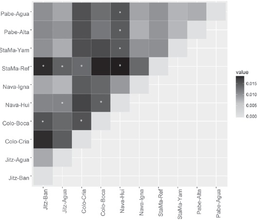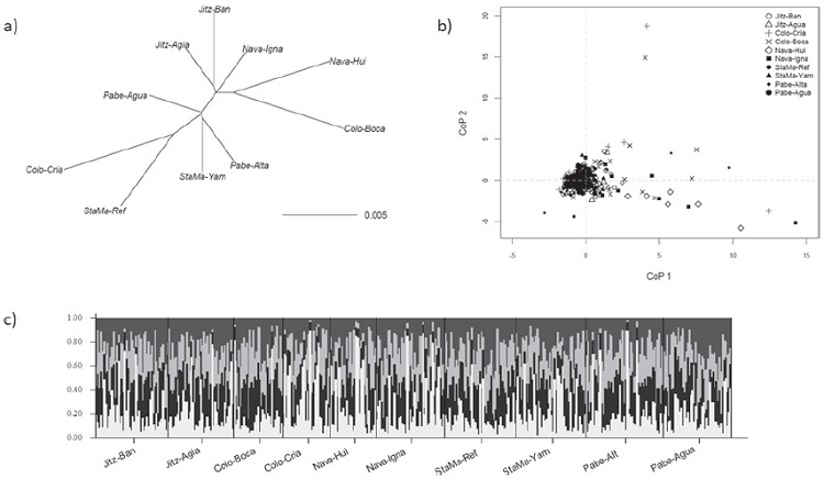 Se obtuvo un valor significativo de diferenciación genética global entre las 10 localidades (Fst = 0.012, p < 0.001). El análisis de Amova dio diferencias significativas entre las lagunas costeras (Fst = 0.004; p < 0.05) y no arrojó diferencias significativas entre los sitios dentro de cada laguna costera (bahía de Jitzamuri, bahía del Colorado, bahía de Navachiste, bahía Santa María y ensenada del Pabellón-Altata; Fig. 1), (Fst = 0.005; p = 0.196). El análisis pareado de Fst indicó que 11 de las 45 comparaciones simultáneas fueron estadísticamente significativas (Fig. 3). Sin embargo, ninguno de los análisis de diferenciación [i.e. distancias genéticas (Fig. 4a), PCoA (Fig. 4b), método de grupos (Fig. 4c)] mostraron una agrupación acorde a la ubicación geográfica de las localidades y las lagunas costeras. Un segundo análisis de Amova agrupando los datos por laguna costera (bahía de Jitzamuri, bahía del Colorado, Bahía de Navachiste, bahía Santa María y ensenada del Pabellón-Altata; Fig. 1), reveló que no hubo diferencias genéticas significativas entre estos cuerpos de agua (Fst = 0.005; p = 0.062).