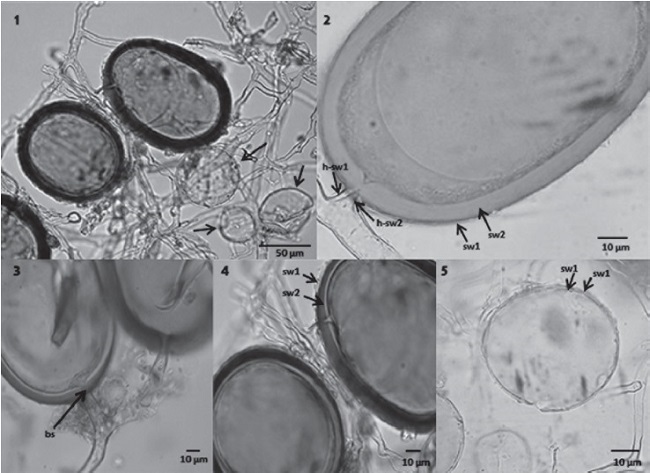 Glomus trufemii B.T. Goto, G.A. Silva & Oehl, 2012 Sporocarps formed as loose clusters, 364-572 µm in diameter; orange-red (2.5YR5/8: Munsell Soil Color Chart) (U.S. Department of Agriculture, 1975) by reflected light, peridium and amorphous material absent. Spores formed apically on short branches of straight hyphae, elliptic, 67-94 × 90-103 µm, to subglobose, 69-97 µm, orange to orange-red (2.5YR6/8) to dark reddish brown (10R4/4) by transmitted light. Spores abortive globose, 34-63 µm, hyaline to light yellow (≈ 2.5Y8/3) when examined with transmitted light, spore wall with 2 layers sw1 and sw2 flexible. Spore wall on mature spores consisting of 2 layers, the sw1 is hyaline, fragile, 1- < 2 µm wide; the sw2 is orange brown (2.5YR7/8) to lighter orange-brown (5YR7/8) at its inner surface, 6-15 µm, laminated. Both layers continued through hyphae at the base of the spore. Pore closure a bridging septum from the sw2. Melzer’s reaction absent. Supporting hyphae light yellow (≈ 2.5Y8/4), 5-12 µm wide at the base of the spore, hyaline and narrowing to 4-10 µm beyond spore, wall 2-4 µm wide (Figs. 1-5).