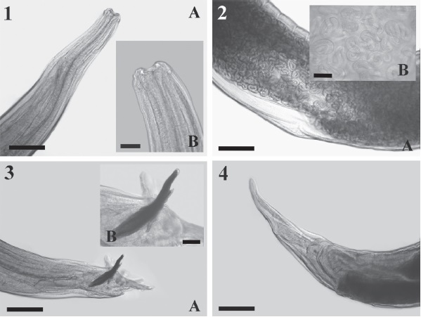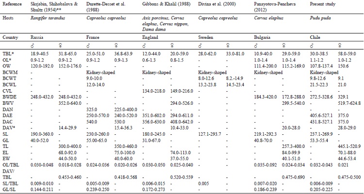 A pool of nematodes kept in the Helminthological Collection of the Laboratory of Veterinary Parasitology of the Universidad Austral de Chile (1163Parasitol. UACh) was used for the present study. The nematodes were isolated from the bronchi of a Southern pudu from an unspecified locality of Los Ríos Region, Southern Chile (40°13’51” S; 72°19’52” O). The lungworms were mounted in Amann’s lactophenol solution for 7 days in order to achieve diaphanization. Then, they were measured with the software ScopeImage v9.0 associated with a light microscope SudeLab. All measurements were expressed in µm, unless otherwise stated, and subsequently compared with published data, i.e. Bienioschek et al. (1996), Divina et al. (2000), Durette-Desset et al. (1988), Gibbons and Khalil (1988), Jansen and Borgsteede (1990) and Panayotova-Pencheva (2012).
