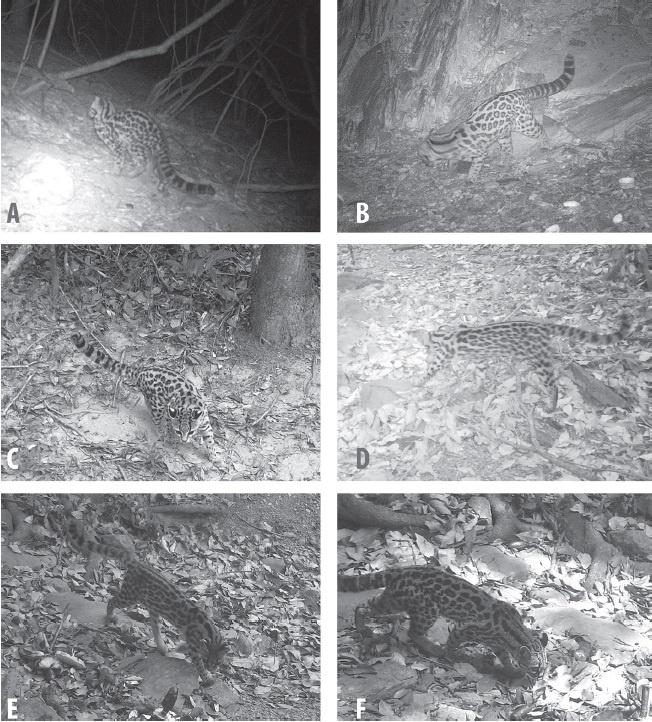 We recorded 5 different margay individuals on 6 occasions, in 4 different areas after a total effort of 4,260 trap-days. One was recorded in a habitat characterized by the semi-arid thorny scrub (caatinga) in Caetité (14o00’20.78” S, 42o38’39.62” W), on 30/07/2015 (Fig. 1A). The remaining 5 were in areas of dry deciduous forest habitat. Four were in Igaporã at 2 different camera stations (13o51’18.59” S, 42o40’19.51” W and 13o52’52.98” S, 42o40’29.02” W) on 15/10/2012, 08/10/2012, 19/10/2012, and 12/01/2014 and the other was in Urandi (14o32’08.78” S, 42o35’04.08” W) on 19/07/2015 (Fig. 1B-F). These new records extend the known range of the margay considerably, by at least 325 km north, 234 km east and 162 km west of the known range, an area extension larger than Portugal or French Guiana (> 90,000 km2) (Fig. 2). They redefine the species’ distribution in northeastern Brazil, the limits of which remain uncertain (Nowell & Jackson, 1996; Oliveira, 1994; Oliveira et al., 2015), and go some way towards bridging this gap in knowledge and helping to define the potential distributional models of margays in northeast Brazil. Additionally, these data represent the first confirmed records of the species using the open vegetation formations that are characteristic of semi-arid caatinga thorny scrub habitats.