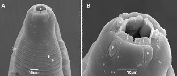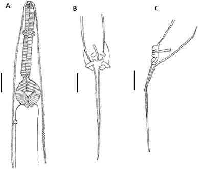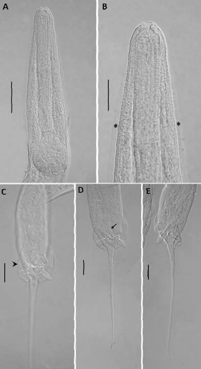 In the original description, Inglis (1962) described the anterior region of the female as having 2 structures similar to teeth, in dorsal view. In the specimens studied here, only 1 tooth was visible in lateral view. Inglis presented measurements of 0.036 × 0.011 mm for a single egg, and no filament was mentioned; while in our material the eggs are larger than in the type material (0.087 × 0.028) and present 1 long filament at each pole. In addition, we also described other important morphological features that were not previously included in the original description, such as buccal cavity and details of the esophagus and pharynx.