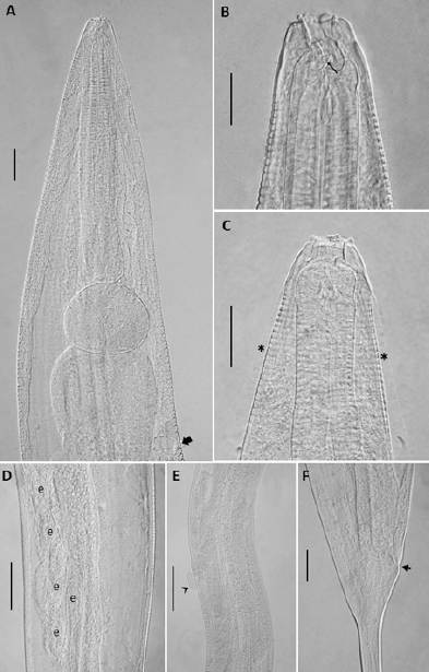 Female (10 specimens). Length of body including caudal spike 2.330-3.425 (2.792), maximum width 0.190-0.275 (0.223). Cuticular striations at middle part of body 0.005-0.007 (0.006) long. Lateral alae very narrow. Anterior end of esophagus forming short, slightly outlined “pharynx”, which anterior end is modified as cuticular edges, like a teeth in lateral view. Buccal cavity 0.015-0.032 (0.028) long and 0.015-0.020 (0.017) wide. Entire esophagus 0.470-0.570 (0.510) long; corpus including “pharynx” 0.380-0.630 (0.436) long and 0.050-0.062 (0.053) wide, “pharynx” 0.017-0.030 (0.023) long; isthmus 0.005-0.010 (0.006) long and 0.017-0.027 (0.026) wide; bulb 0.100-0.125 (0.109) long and 0.110-0.150 (0.125) wide. Nerve ring and excretory pore 0.125-0.142 (0.133) and 0.500-0.740 (0.603), respectively, from anterior extremity. Vulva slightly anterior half of the body, 0.780-1.135 (1.047) from anterior end. Uterus prodelphic. Muscular vagina directed anteriorly from vulva. One ovary anterior to level of vulva; other one posterior to it. Uterus containing numerous oval eggs, 0.077-0.092 (0.087) × 0.025-0.032 (0.028). Each egg pole provided with 1 very long filament. Entire tail 0.670-0.940 (0.797) long; length of slender caudal spike 0.520-0.730 (0.628).