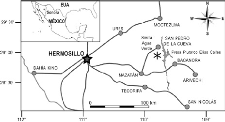 La sierra Agua Verde se lcaliza aproximadamente a 110 km al este de Hermosillo, Sonora, en el municipio de Villas Pesqueira, con coordenadas 29°12’10.50” N, 109°54’11.65” O (Fig. 1).
