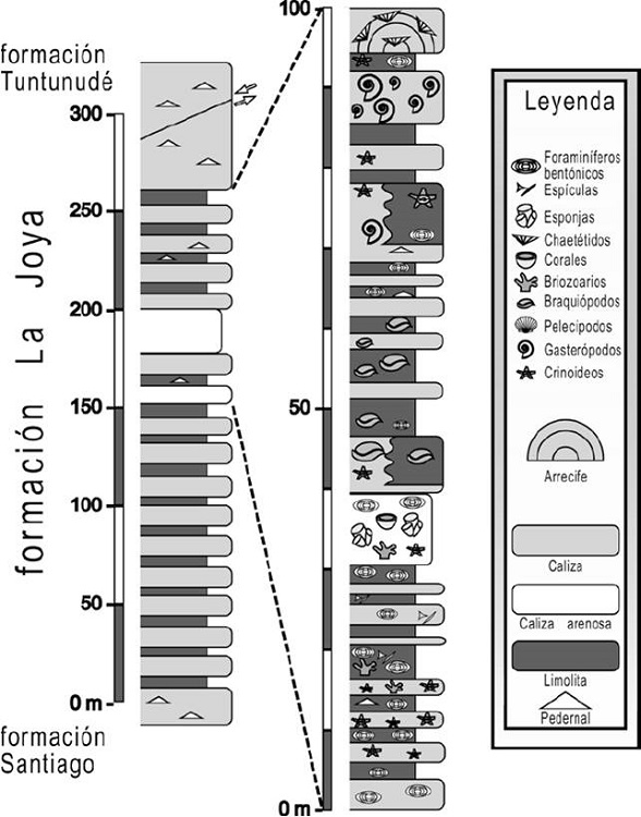 La formación La Joya está constituida por 300 m de caliza intercalada con lodolita y lentes arenosos. Los estratos de caliza contienen una biota abundante y diversa que consiste en algas, foraminíferos, corales, briozoos, braquiópodos y crinoides (Fig. 2). La cima de la formación La Joya presenta contacto por falla normal con la formación Tuntunudé y es correlacionable con la formación Picacho Colorado (Noll, 1981) y la caliza Aparejo (Vega y Araux, 1987) de ambientes marinos de plataforma con caliza y caliza ligeramente recristalizada, intercaladas con dolomía y caliza bioclástica que se presentan en el arroyo Agua Caliente.