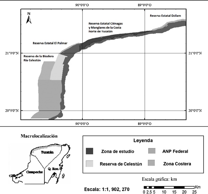 Yucatán es un estado costero cuyo cordón litoral tiene una longitud de 342.47 km (Contreras, 2010), en el que se encuentra ubicada la Reserva Estatal Ciénagas y Manglares de la costa norte de Yucatán (RECMY), con una superficie total de 54,776.726 ha, dividida en 3 áreas: 1) occidental, que abarca de los poblados costeros de Sisal y Chuburná, 2) el área central, que va de Chuburná a San Benito y 3) el área oriental, de San Benito a Dzilam de Bravo (Diario Oficial del Gobierno del Estado de Yucatán, 2010).