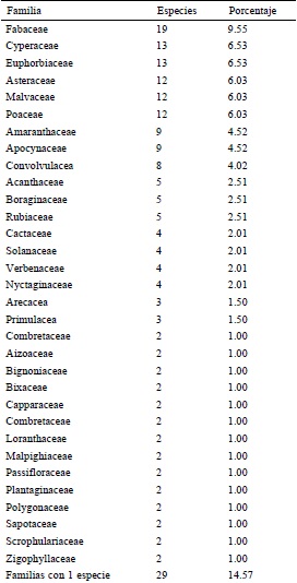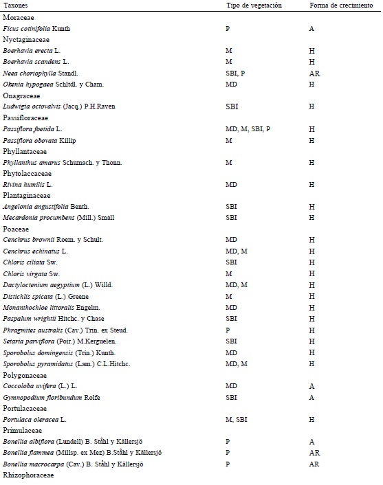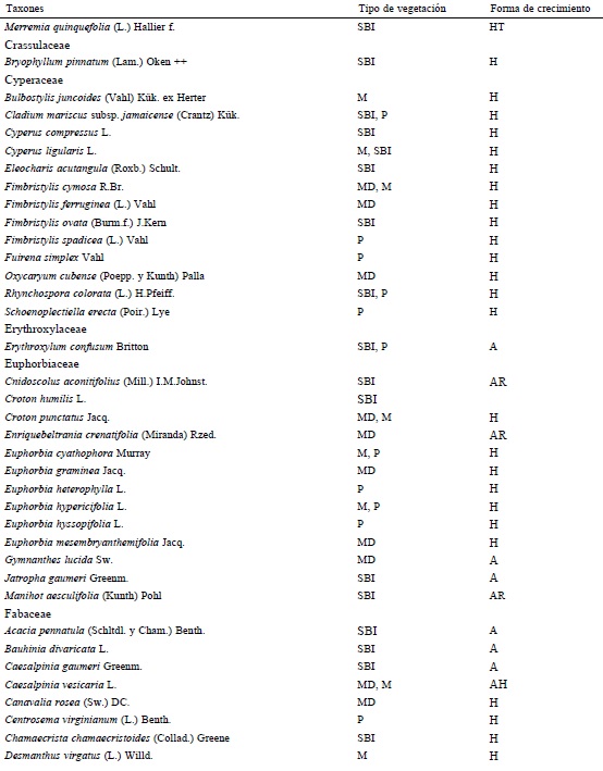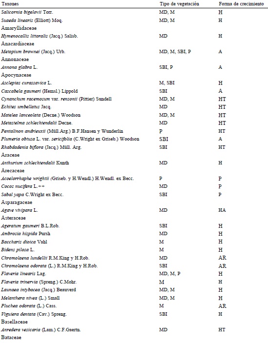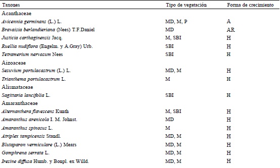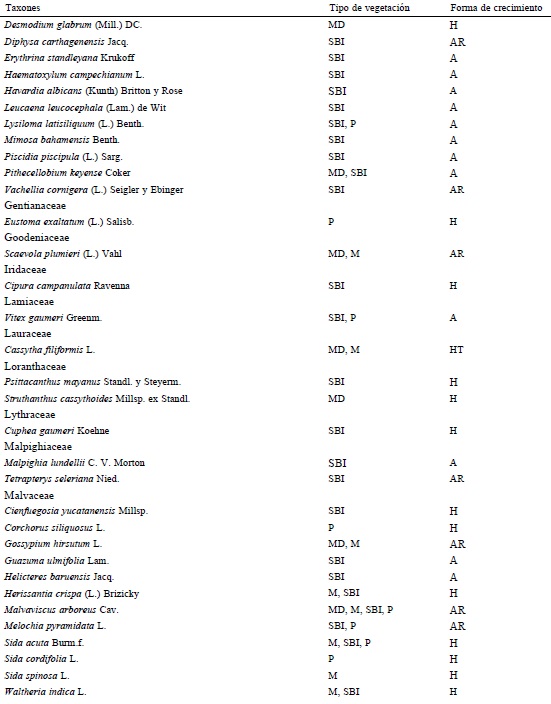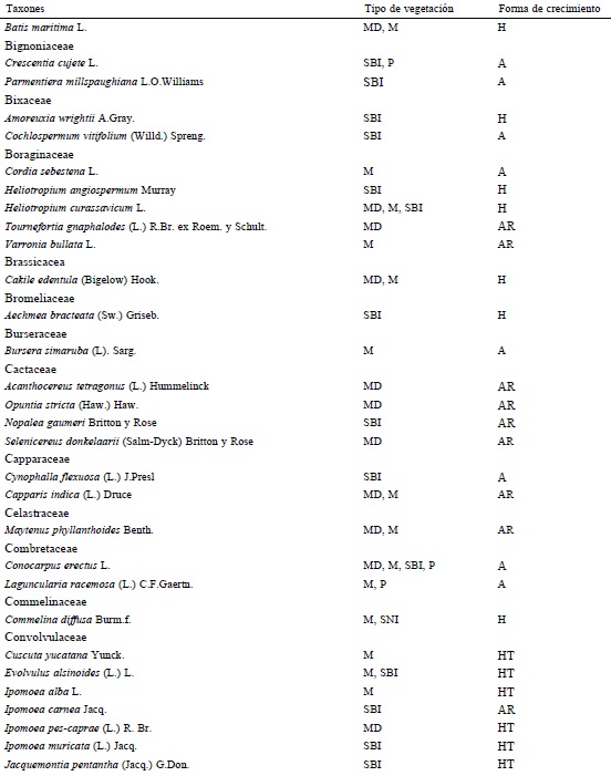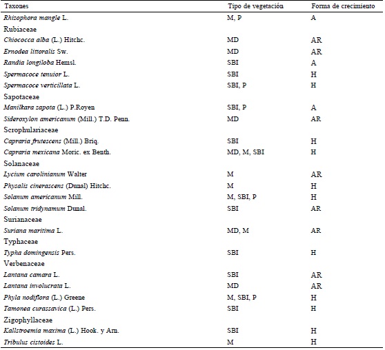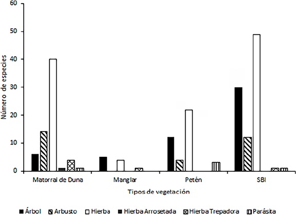 Los resultados de vegetación incluyeron la recolección de 2,301 ejemplares que fueron herborizados, de ellos 2,270 fueron entregados a los herbarios MEXU, CICY, UADY (98.6%), los restantes 31 ejemplares (1.4%) aún no han sido identificados. Se registraron 60 familias, 167 géneros y 199 especies (Apéndice 1). El mayor número de especies pertenecen a las familias Fabaceae (19 especies), Cyperaceae y Euphorbiaceae (con 13 especies cada una), Asteraceae, Malvaceae y Poaceae (con 12 especies cada una), Amaranthaceae y Apocynaceae (con 9 especies cada una), Convolvulacea (8 especies) que juntas representan más del 50% de las especies (Tabla 1). Entre las especies se presentaron las formas de crecimiento arbórea (41 especies), arbustiva (30 especies), herbácea (115 especies), hierba trepadora y arrocetada (3 y 1 especies respectivamente), también se encontraron 3 especies de palmeras. En el matorral de duna costera la forma de crecimiento predominante fue la herbácea (40 especies), cabe señalar que también se encontraron individuos juveniles de los mangles C. erectus, A. germinans, R. mangle y L. racemosa. La forma arbórea predominó en el manglar (5 especies) y en el petén (12 especies), mientras que en la selva baja inundable hubo un mayor número de herbáceas (49 especies) que de arbóreas (30 especies) (Fig. 2).