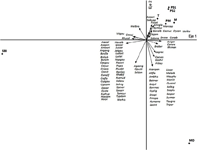 El análisis de componentes principales (PCA) realizado explicó el 79% de la variación de los datos con los 2 primeros ejes por lo que la representación gráfica muestra la información existente en los datos con poca distorsión. La vegetación de petén (PS1, PS2, PM), tasistal (T) y manglar (M) comparten especies y los valores de correlación son significativos (p < 0.05). En cambio, los sitios de la selva baja inundable (SBI) y matorral de duna (MD) presentan especies vegetales distintas de las que caracterizan el petén, el tasistal y el manglar (Fig. 3). Cabe señalar que no se incluyó a los tifales en el análisis por ser pequeños manchones monoespecíficos.