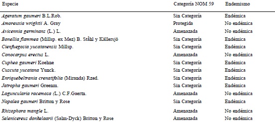 Se reportan 6 especies que se encuentran bajo alguna categoría de la Norma Oficial Mexicana 059-Semarnat-2010 (Semarnat, 2010). Seis especies son consideradas como amenazadas, entre las que se incluyen las 4 especies de mangle presentes en México (A. germinans, C. erectus, L. racemosa y R. mangle), 1 especie de la familia Cactaceae (Selenicereus donkelaarii) y Amoreuxia wrightii considerada como protegida. También se encontraron 8 especies endémicas de la porción mexicana de la provincia biótica de la península de Yucatán, de las cuales ninguna se encuentra en alguna categoría de la NOM-059-Semarnat-2010 (Tabla 2). Se reporta una especie de palmera introducida, C. nucifera dentro de un petén.