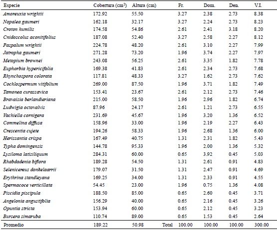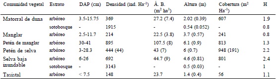 Manglar (M). Esta comunidad vegetal se encuentra bordeando ambos lados de la ciénaga y la laguna, incluso se encuentra tierra adentro y con elementos florísticos en la duna costera. Presenta un estrato arbóreo con DAP de 3 cm a 11.7 cm, 214 individuos/ha, área basal de 22.5 ± 3.8 cm2, altura de 3.7 ± 0.57m y cobertura de 241 m2ha-1(Tabla 3). Los VI más altos corresponden a A. germinans (56.35) y C. erectus (40) (Apéndice 2). Tuvo alta riqueza florística (15) ya que se pueden encontrar elementos del matorral de duna costera tales como Cordia sebestena, Pithecellobium keyense y Metopium brownei, lo cual nos indica la cercanía entre las dos comunidades, pero la diversidad fue baja (Tabla 3).