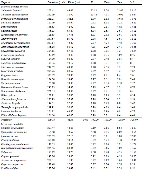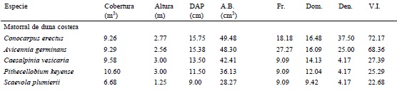 Matorral de duna costera (MD). El matorral se localiza a todo lo largo del litoral costero a excepción de una pequeña franja pegada a la entrada de la laguna, donde la vegetación que está en contacto con el mar es manglar. El estrato arbóreo presenta diámetros a la altura del pecho (DAP) de 3.5 a 15.75 cm, 369 individuos/ha, área basal de 27.2 ± 7.4 cm2, altura de 2.02 ± 0.39 m y cobertura de 607 m2 ha-1 (Tabla 3). Los valores de importancia (VI) más altos corresponden a los mangles C. erectus (72.17) y A. germinans (68.36) y a las leguminosas Caesalpinia vesicaria (27.39) y Pithecellobium keyense (25.29) (Apéndice 2). En tanto que el sotobosque tuvo 1,915 individuos/ha con una altura de 0.54 ± 0.05 m (Tabla 3). Los VI más altos corresponden a individuos de Salicornia bigelovii (38.12) y Sesuvium portulacastrum (34.44), así como Bravaisia berlandieriana (18.73) y Distichlis spicata (16.26), Batis maritima (13.86) y Opuntia stricta (13.18) especies típicas de este estrato (Apéndice 3), así mismo, se observaron plántulas de mangle. Se reporta una mayor riqueza florística en el sotobosque (27) que en el estrato arbóreo (11) y mayor diversidad en el estrato arbóreo (1.9) que en el sotobosque (0.8) (Tabla 3).