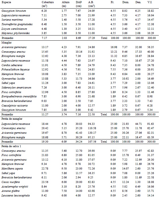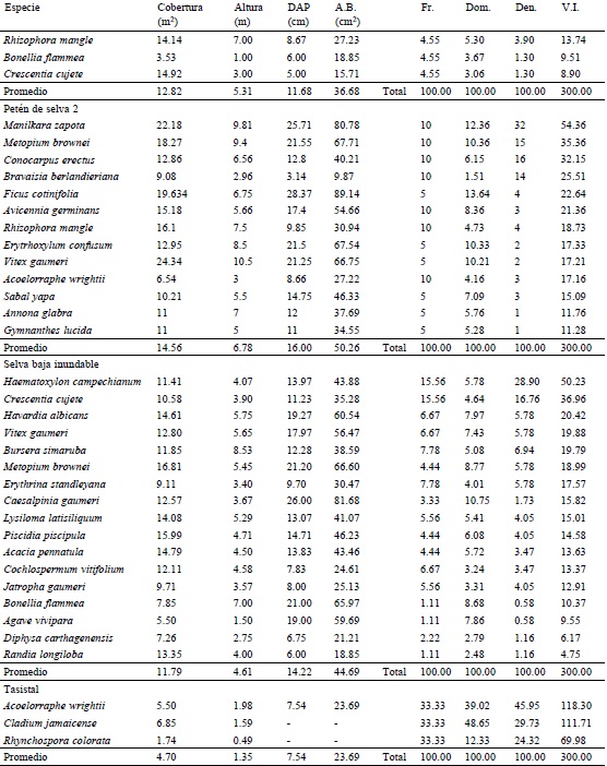 Keywords: Coastal dune shrubs, Mangrove, Petén, Tropical low flooding forest, Tasistal, Tifal.