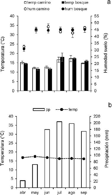 Las parcelas próximas al camino principal presentaron un intervalo de apertura del dosel de 27.05-33.8%, mientras que las parcelas alejadas del camino mostraron un intervalo de 18.51-23.73%. El porcentaje de luz transmitida fue mayor en el primer grupo (38.73-60.3%), mientras que en el segundo grupo estuvo entre 27.65-34.33%; la relación R: RL para el primer grupo fue de 1.21-1.37 y para las parcelas más alejadas de 0.99-1.13. Los valores de humedad y temperatura durante el muestreo no variaron significativamente entre las parcelas cercanas y las alejadas del camino principal (R2 humedad = 0.6609, p = 0.1870; R2 temperatura = 0.30, p = 0.45); cabe mencionar, que el contenido de humedad del suelo incrementó durante los meses de julio a septiembre en todas las parcelas (Fig. 1a).