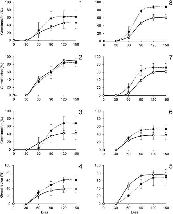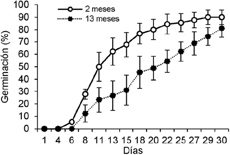 En ambiente controlado se observó que, aunque las semillas de 2 meses de almacenamiento comenzaron a germinar más rápido en comparación con las de 13 meses (Fig. 4), el inicio de la germinación (F1,4 = 0.8470, p = 0.4090), la tasa máxima (F1,4 = 7.1960, p = 0.0551) y la capacidad germinativa (F1,4 = 1.1370, p = 0.3460) no difirieron entre cohortes. Por otra parte, la capacidad germinativa no difirió entre los tratamientos de luz y oscuridad (F3,16 = 1.5590, p = 0.2380), entre cohortes (F1,16 = 0.238, p = 0.632), ni entre la interacción tratamiento * tiempo de almacenamiento (F3,16 = 1.008, p = 0.415). Independientemente de la cohorte o del tratamiento de luz, la capacidad germinativa estuvo por arriba del 70% y se logró en sólo 30 días (Figs. 3, 4).