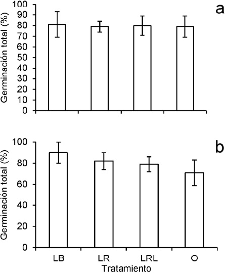 Germinación en el laboratorio. En mayo de 2014 se desinfectaron 450 semillas almacenadas de la primera y segunda recolecta, con hipoclorito de sodio al 1% durante 3 minutos. En este caso ya no se realizaron escarificaciones porque para ese entonces ya conocíamos que el tejido fibroso del pericarpio no es una barrera impermeable para la imbibición. Se sembraron 30 semillas NE en 24 cajas de Petri (9 cm de diámetro) con papel absorbente (previamente esterilizado) húmedo como sustrato. Las cajas se sellaron con una película plástica (Egapack, México) y se formaron 4 tratamientos con 3 réplicas por cohorte; los tratamientos fueron: 1) luz blanca (LB; densidad de flujo fotónico (DFF) = 33.21 µmoles m-2 s-1, R: RL = 1.73; 2) luz roja (LR; DFF = 5.18 µmoles m-2 s-1, R: RL = 3.39); 3) luz roja lejana (RL; DFF = 1.2 µmoles m-2 s-1, R: RL= 0.05), y 4) oscuridad (O). La DFF, entre 400 y 700 nm, fue medida con un cuantómetro (Apogee, model MQ-200, Apogee Instruments, Inc., Logan, UT, USA) y la relación R: RL (R = 640 - 670 y RL = 690 - 748 nm) fue medida con un radiómetro SKR-100 (Skye Instruments, Scotland). Para el tratamiento LR, las cajas de Petri se introdujeron en una caja de plexiglass (48 × 32 × 8 cm) rojo (de 3 mm de espesor, Serie 2424 Rohm and Hass, México). Para el tratamiento LRL, las cajas de Petri se introdujeron en una caja construida con una capa de plexiglass rojo y una capa de pexiglass azul (Serie 2423). Para el tratamiento O, las cajas de Petri se envolvieron con papel aluminio. Las cajas se colocaron en una cámara de ambiente controlado (Nuaire modelo I-36LL, EUA) a 22 °C/20 °C, con un fotoperiodo 16/8. Las cámaras estaban equipadas con lámparas fluorescentes OSRAM de 17 watts y 60% de humedad relativa. Durante 30 días, cada 2 días, se registró la germinación en las cajas LB y hasta el día 30 el número total de radículas en los demás tratamientos.