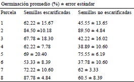 Germinación en campo. Debido a que en pruebas previas al montaje del experimento la sospecha de una latencia física tuvo lugar al ocurrir la germinación poco después de un procedimiento de escarificación sobre la semilla, se ejecutó este procedimiento en 1,440 semillas 1 semana después de la recolecta y se realizó la remoción manual con pinzas de una porción longitudinal del pericarpio de la semilla (fruto) para permitir su hidratación. Se elaboraron 48 bolsas de 15 cm2 de malla de polipropileno con abertura de 1 mm2. Se introdujeron 30 semillas escarificadas (E) en 24 bolsas y 30 no escarificadas (NE) en las 24 restantes. En cada una de las parcelas se sembraron 6 bolsas de cada tipo de semillas dispuestas en 2 diagonales opuestas con una intersección en el centro de la parcela. De abril a septiembre de 2013, se registró mensualmente la germinación por parcela. Las semillas germinadas iban siendo descartadas de las bolsas, las cuales se volvían a colocar en su lugar.