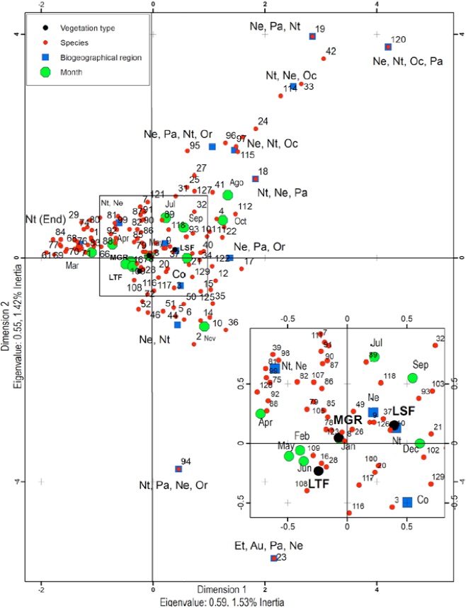 The association of species on type of vegetation, month of collection, and their assigned biogeographical distribution was performed with a multiple correspondence analysis (Abdi & Valentine, 2007; Legendre & Legendre, 2003). The biogeographical distribution of each species was obtained from Yu et al. (2015), and those cataloged as Neotropical-endemic to Mexico (Nt-End) were based on Ruíz-Cancino (2010). The multiple correspondence analysis is a modification of X2 used to analyze multiple categorical variables and creates a Cartesian diagram based on the association among more than 2 categorical variables (Legendre & Legendre, 2003). The diagram displays simultaneously the relative position of the categories of variables studied (Gotelli, 2001). The positions of the categories reflect the degree of association among them, nearest categories of different variable represent a high association, while distant categories show lower association. This analysis was performed with the program Statistica version 12 (StatSoft, 2007).