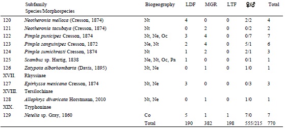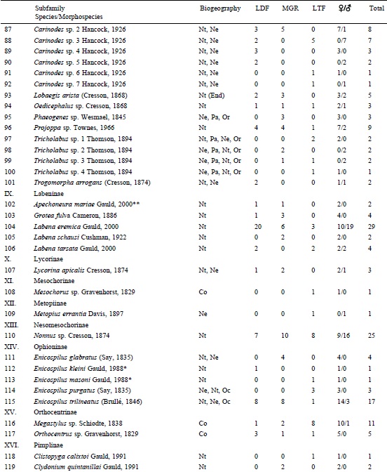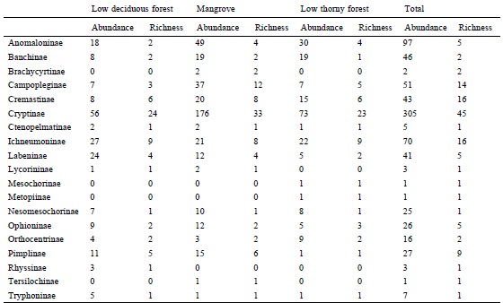 The mangrove area had the highest richness with 88 species of which 31 were exclusive for this site. Sixty-four species (17 exclusive) were collected in LDF, whereas 61 species were collected in LTF (18 were exclusive) (Appendix). The most species-rich subfamilies were Cryptinae (45 species), Cremastinae and Ichneumoninae (both with 16 species), and Campopleginae (14 species). The most species-rich genera were Eiphosoma with 8 species, and Lymeon and Carinodes, with 7 species each.
