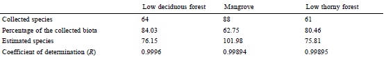 The maximum values of the Clench function curve for each site are presented in Table 3. The coefficient of determination was greater than 0.9 in all 3 cases, indicating the data were properly matched to the function. This analysis showed that the mangrove site, with 102 estimated species, could potentially be the richest in ichneumonid species of the 3 collected sites. The number of estimated species for the 2 other vegetation types was of 76 in both cases (Table 3).