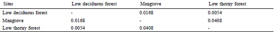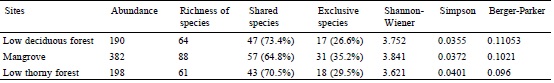 These community differences at the 3 sites were not detected in terms of the proportional abundance of each species. That is, the Shannon-Wiener and Simpson indexes were similar for the 3 data sets (Table 5). The t-test carried out on the Simpson index data did not indicate a significant difference between the mangrove and LDF (t(434) = -0.924; p > 0.05) or between LDF and LTF sites (t(387) = 1.245; p > 0.05); the only statistically significant difference was detected by comparing the alpha diversity of the mangrove and LTF (t(445) = 2.277; p < 0.05). This indicates that the probability of taking 2 individuals of the same species was greater in LTF than in mangrove, and the uncertainty of knowing the identity of a species was greater in mangrove than in LTF. The Berger-Park index, which expresses the number of individuals in proportion to the most abundant species, did not differ between locations (Table 5).